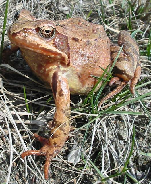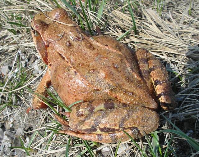 Zdenek 31.03.2003 15:43 - Ta žába byla tak perfektně fotogenická a na víc se fotografovala ráda.(Což nebývá zvykem).Celo dobu při focení seděla bez pohnutí, jen jsme začali balit vercajk odskákala a zmizela v suché trávě.