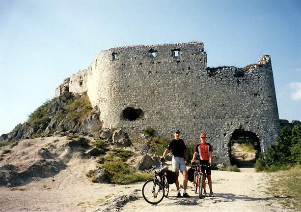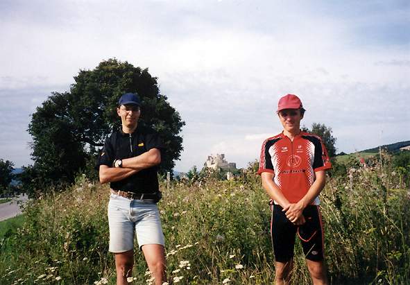 DRTIC 09.08.2002 10:05 - Nas cil, bylo nutne vyfotit ze jsme to dokazali :-) Ale sil bylo porad dost, takze jsem jeste zajeli na Beckovsky hrad a pak do Piestan. Teprve v Piestanech kdyz uz bylo kolem 20h a tachometr ukazoval hrde 110km jsme slezli z kol :-)