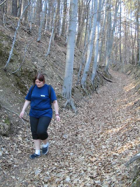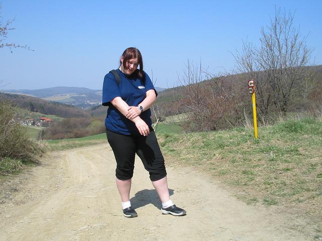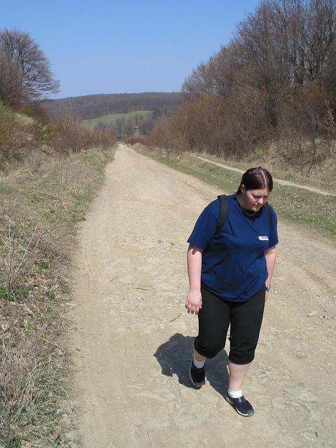 DRTIC 21.04.2003 22:31 - Prvni stoupani do kopce za Lazy :-) Usmev jiz neni tak zarivy ale Janca statecne stupa vzhuru :-) Po prave strane je hezky vyhled na Kudlov a na trasu kterou jsme sli v noci :-)