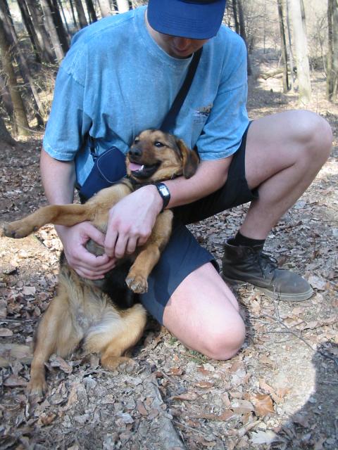 DRTIC 21.04.2003 22:36 - Prima zazitek. Po ceste se k nam pripojilo tohle roztomile stenatko z blizke chalupy. Asi si neco podobneho taky poridim, az budu dostatecne bohaty a budu mit rodiny domek a osobniho sofera.
