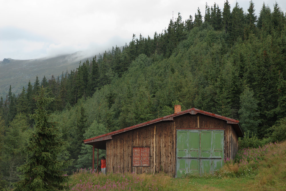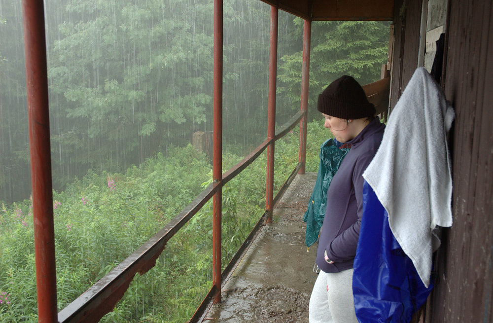 DRTIC 16.08.2008 1:28 - Prvni trable kolem 1000mnm. Kdyz jsme pokracovali dal, spustil se solidni lijak. Stani v lese v plastenkach vydrzi bavit jen chvili tak jsme dest nedest pokracovali az k teto bohem seslane chate kde jsme se prevlekli aspon zo zbytku suchych hadru a cekali az se vyprsi :-) Vyska 1400nm a prognozy nevesele. Udrzet v teto chvili vesely az laskovny ton nebylo snadne :-))) Janca ma odvekou snahu vse drmatizovat a divat se na vec zasadne podle katastrofickeho scenare :-)
