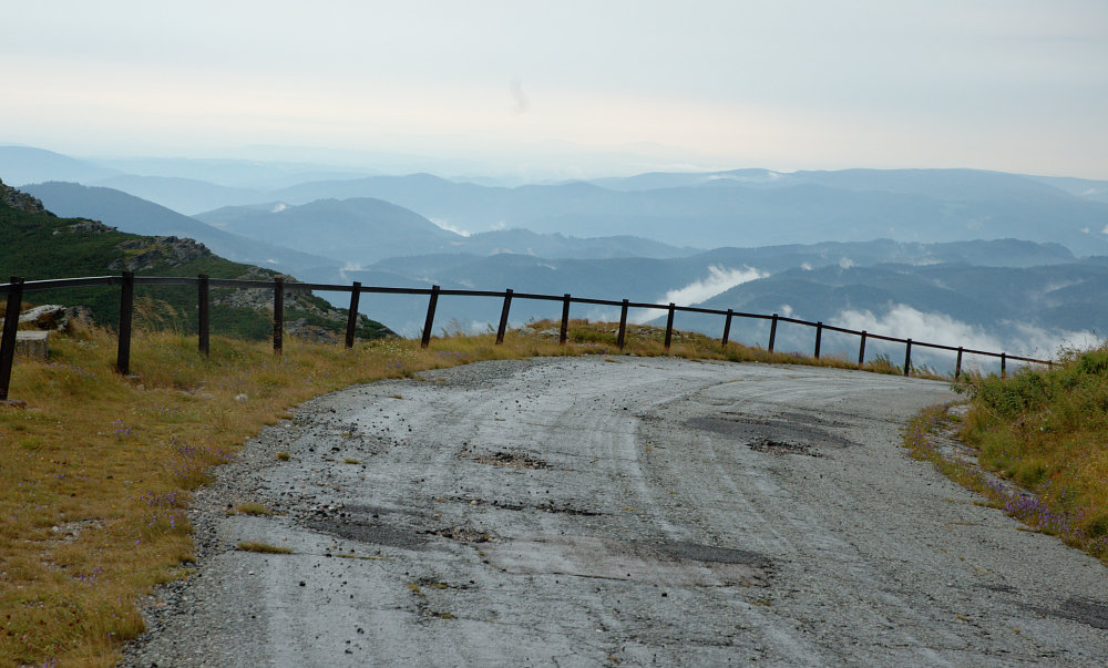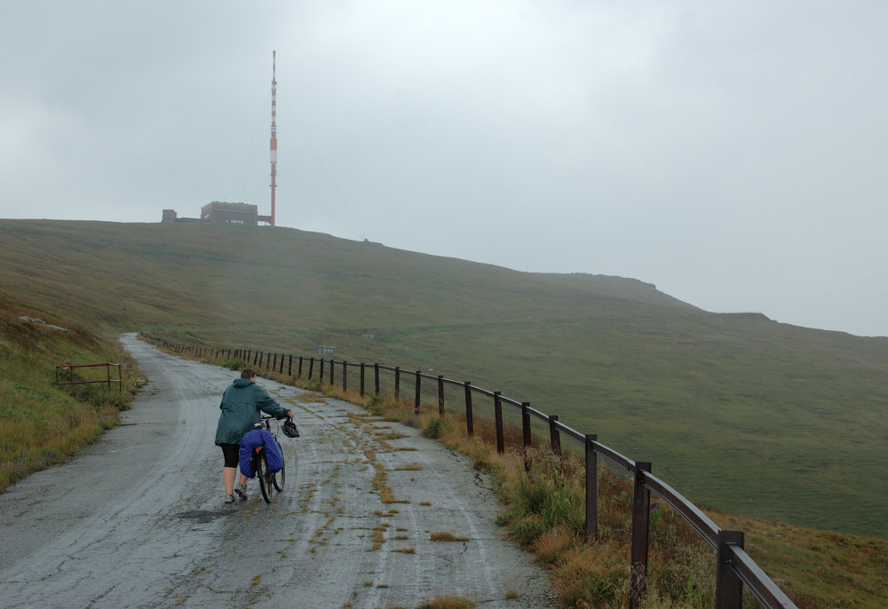 DRTIC 16.08.2008 1:23 - Vlevo v mracich nas cil :-))) Krasnym pocasim lakajici vysilac na Kralovej hole. V ceste jedina vesnice Sumiac, kde se podle prispevku na netu nedoporucuje zpomalovat, natoz zastavovat :-) I kdyz musim zaklepat, mistni si nas vcelku nevsimali, asi jim nase duralove ramy prisly moc lehke na to aby se daly zpenezit ve sberne :-)