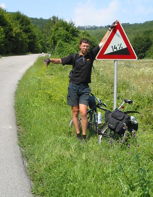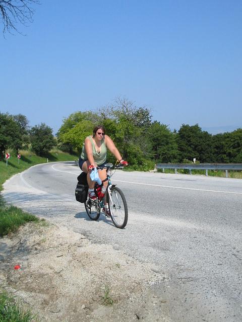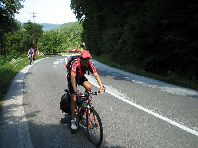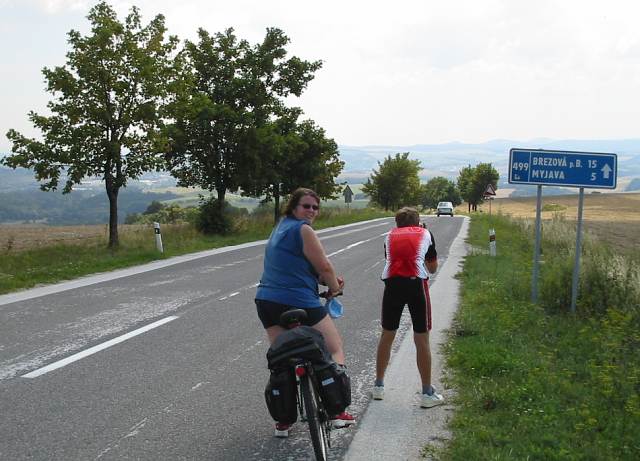 DRTIC 09.08.2003 22:50 - Stoupani nad obci Brezova :-) Tam to male co tlaci kolo je Janca a asi premysli jak me uskrti az me dozene. No nebyla tahle dovolena uzasna...kam se hrabe recko :-)