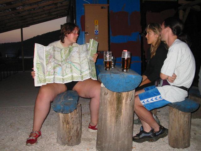 DRTIC 09.08.2003 20:29 - Konzultace nad mapou v mistnim obcerstveni. Pred nami 3 den a plany navrat do Partyzanskeho, Banovce, Trencanske Teplice a konecne Trencina :-)