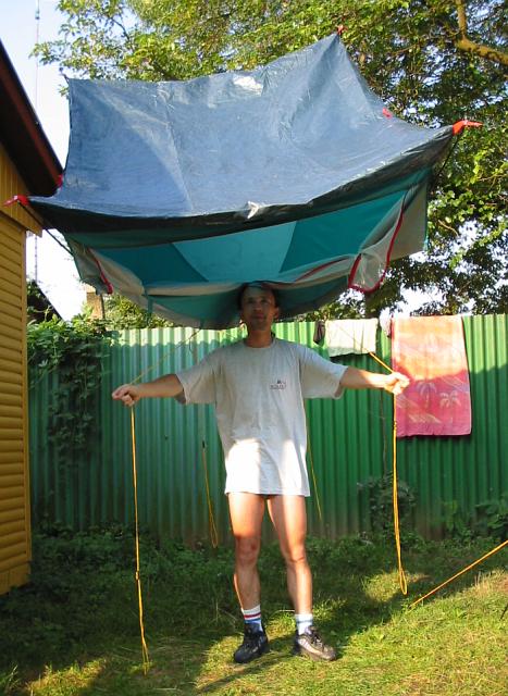 DRTIC 09.08.2003 22:24 - Tenhle stan zvladam postavit levou zadni v rekordne kratkem case :-) Nez si ostatni stacili sundat brasny z kol ja uz mel postaveno.....tedy stan :-)