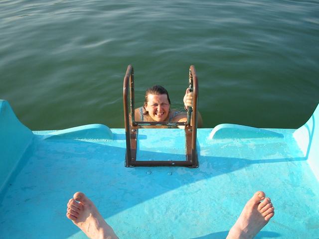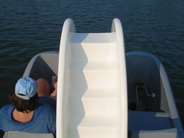 DRTIC 09.08.2003 20:47 - Nas delfin (slapadlo ve tvaru 2 delfinu) :-))) idealni rodinne plavidlo. vepredu skluzavka, vzadu schudky, spousta prostoru a bylo to vcelku nepotopitelne :-))aspon to vydrzelo me odvazne manevry s kormidlem.