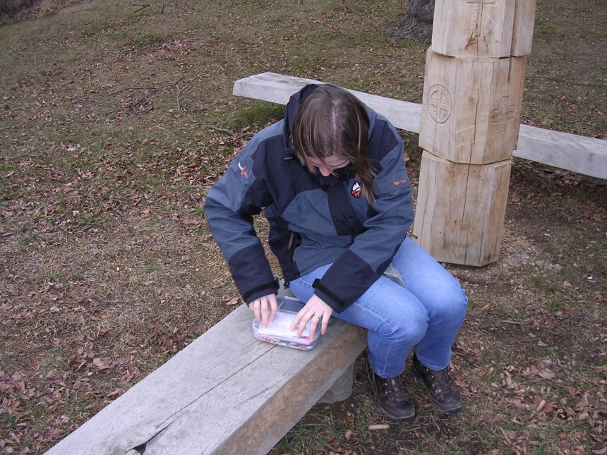 Janinka 19.02.2008 13:07 - Vetrny mlyn v Trebici. Na teto fotce zatim jen opisuju nejake letopocty pro vypocet finalni souradnice. Chvilku pote jsme s Vojtou naklusali s metrem a merili obvod mlyna. Kolemjdouci se na nas divne divali, ale my, zkuseni kaceri, se nenechame jen tak rozhodit:oD
